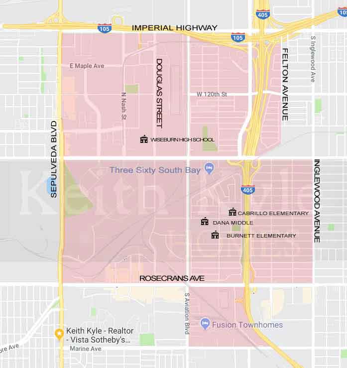 As the Wiseburn district is hightly sought after the district has boundary requirements for local residents. The district boundaries are roughly Sepulveda Boulevard on the west, Marine Avenue on the south, Imperial Highway on the north, and Inglewood Avenue on the east. **Please note that we are providing the following for information only and cannot guarantee eligibility to the district. Please consult with the district offices to determine residency restrictions and elegibility for the district.